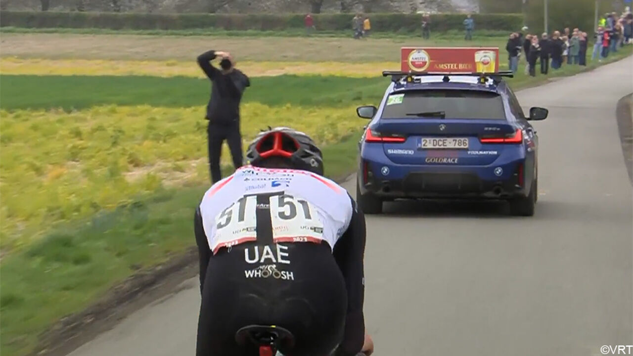 これはレースを見ていた人も思ったはず。レースディレクターの乗ったオフィシャルカーがタデイ・ポガチャルの前を走る事態に。