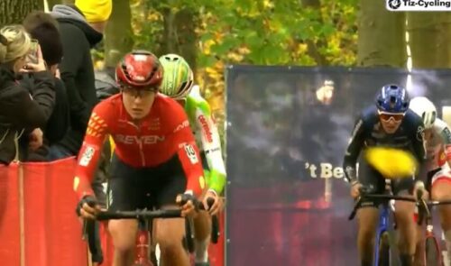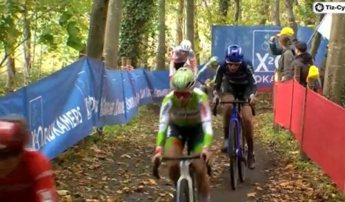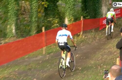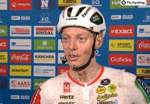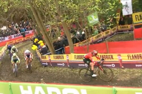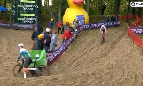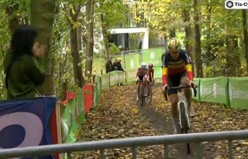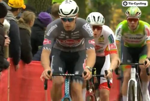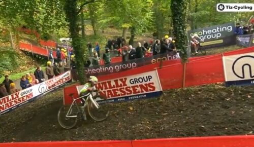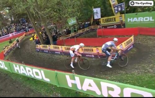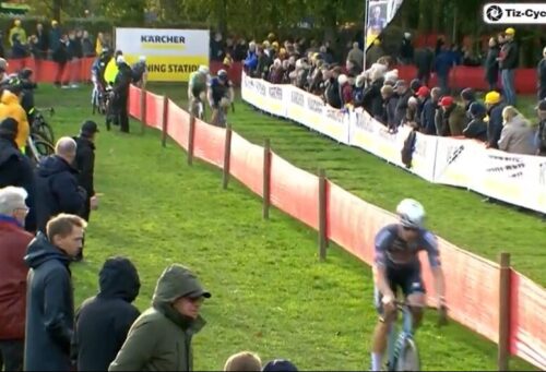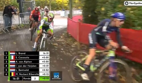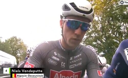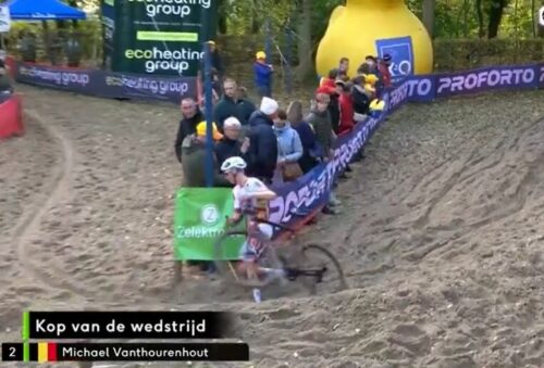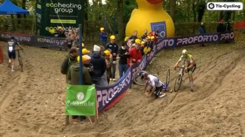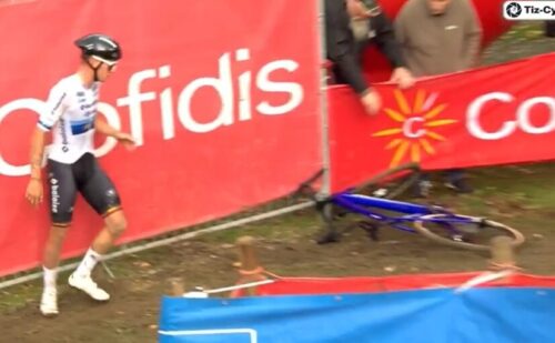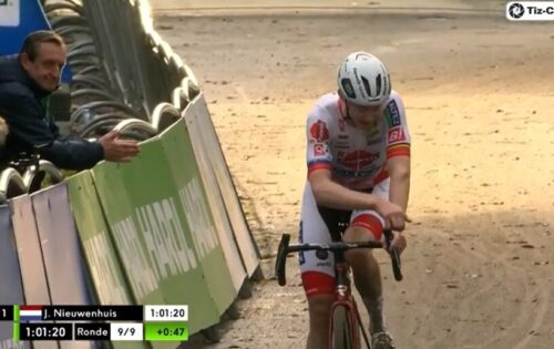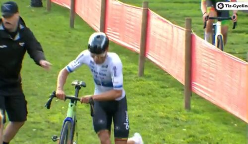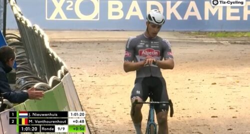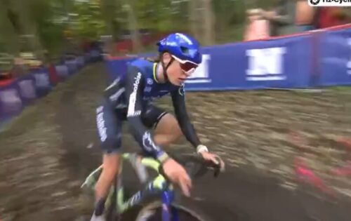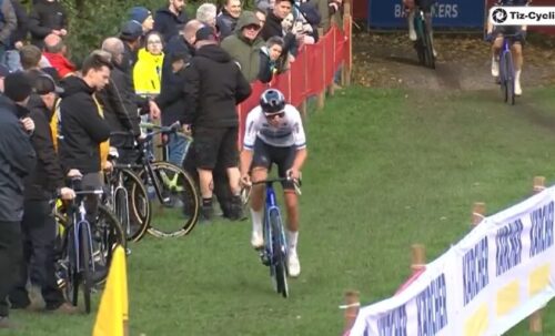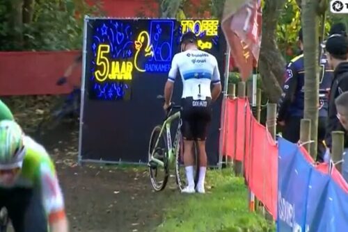 滑ってしまって脚をついたニルス・ファンデプッテはバイク交換。