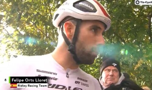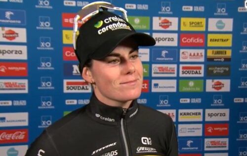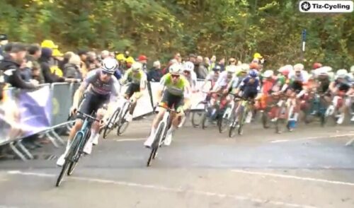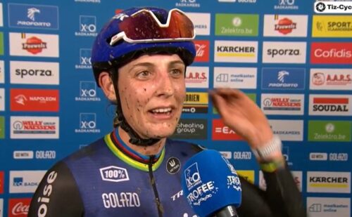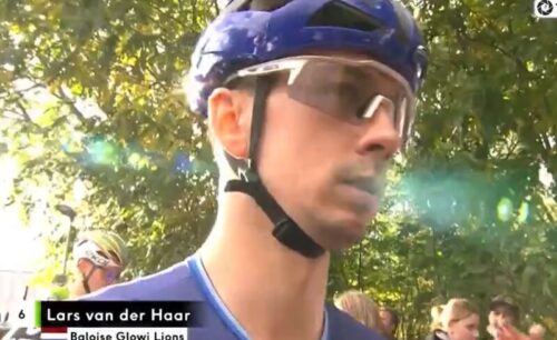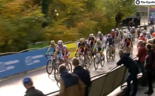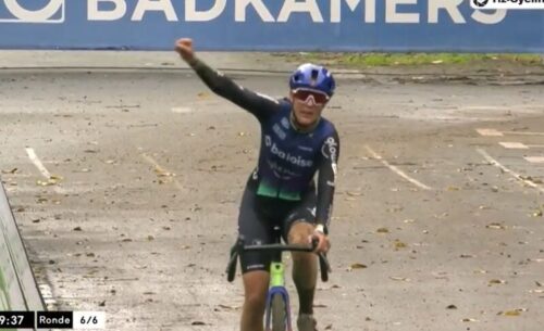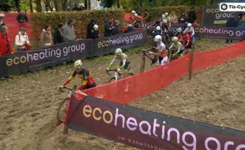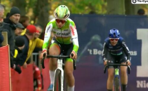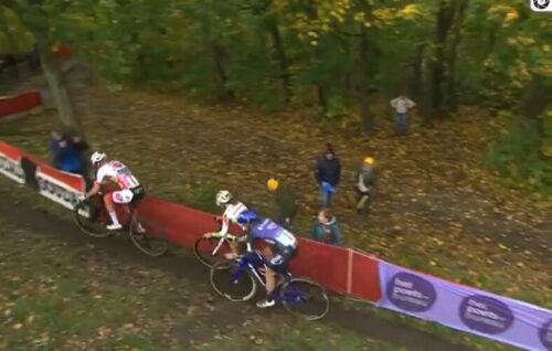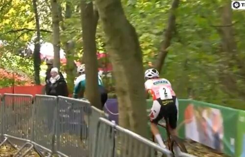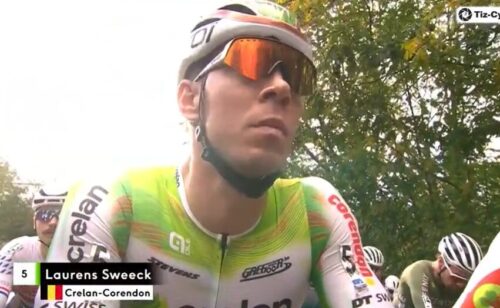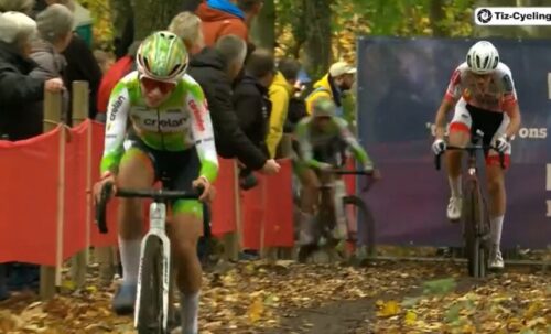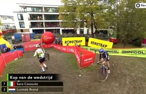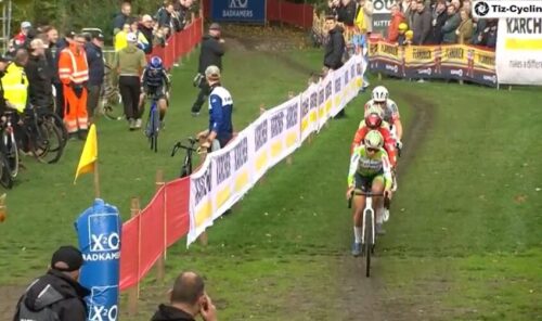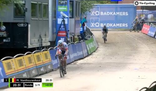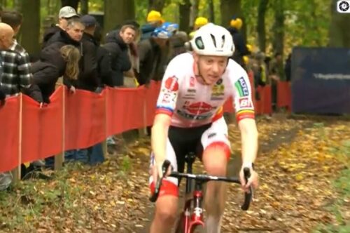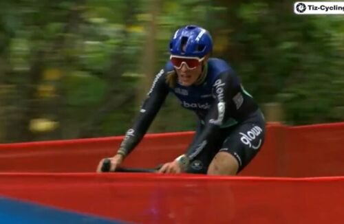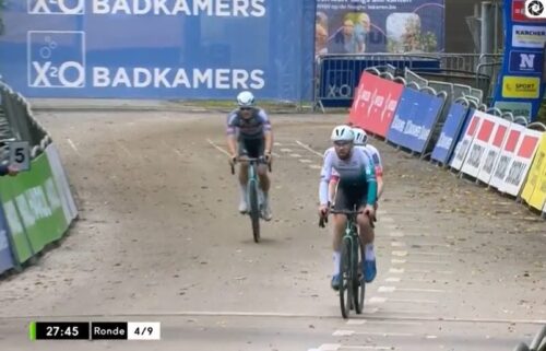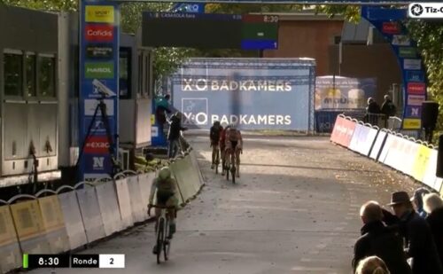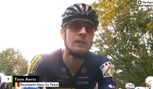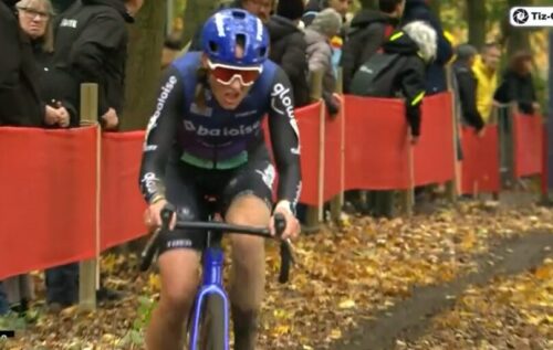 滑ってしまって脚をついたニルス・ファンデプッテはバイク交換。