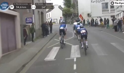 集団はDecathlon AG2R La Mondiale Team、Arkéa – B&B Hotelsが引いている。結構タイム差を一気に縮めている感じだ。