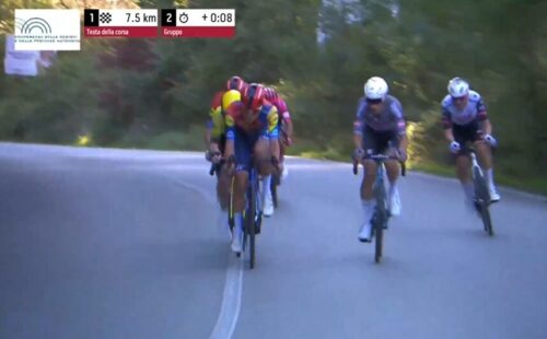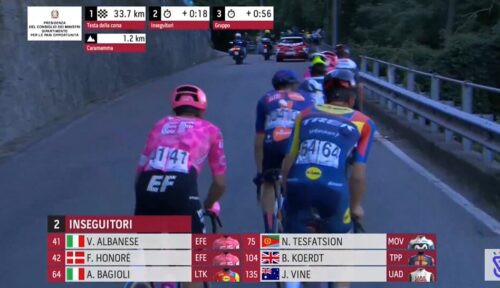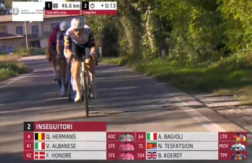 こちらが第2集団。ジェイ・ヴァイン、EF Education-EasyPostのヴィンチェンツォ・アルバネーゼ、ミッケルフレーリク・ホノレ、Lidl – Trekのアンドレア・バジオーリ、テスファチオン・ナトネルなど。