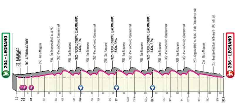 スタートは、レニャーノ。ゴルナーテ・オローナとその周辺で16.8kmのローカルサーキットを7周する。途中にモラッツォーネ/ピッコロ・ステルヴィオへの登りが含まれている。