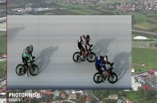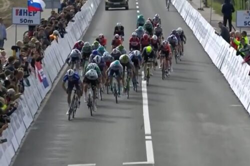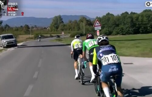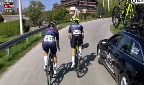 Bahrain Victoriousのフラン・ミホリエヴィッチは捕まった。後ろはUAE Team Emirates – XRGのブランドン・マクナリティ。