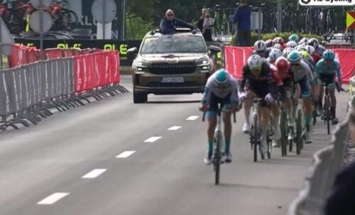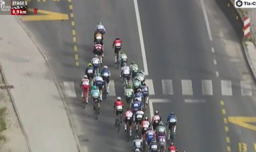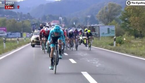 Bahrain Victoriousのフラン・ミホリエヴィッチがエドアルド・ザンバニーニのために引いている。