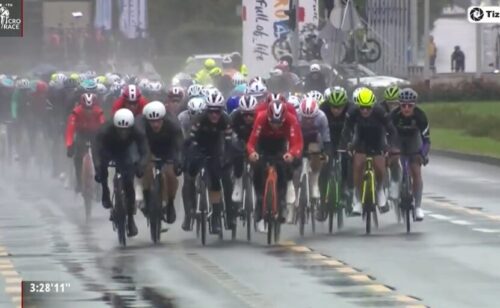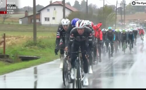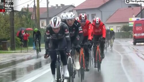 残り68.4kmでタイム差は1分。集団はSoudal – Quick Stepが引く。今日はあいにくの雨だ。