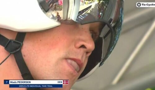 レムコ・エヴェネプールがスタート。このバイザーも来シーズンは使えないんだっけ。レムコのはバーに顔を近づいた時に深いポジションが取れるようになっている。