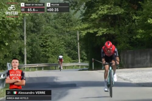 60km/hオーバーで走っている。Arkéa – B&B Hotelsのアレッサンドロ・ヴェーレだ。