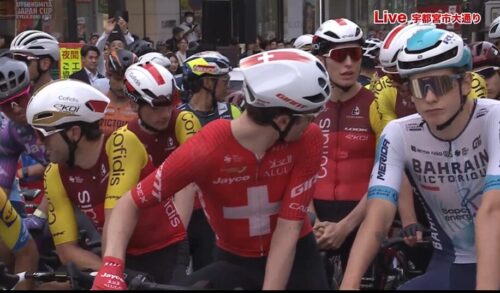 スタート前。Team Jayco AlUlaのマウロ・シュミットもいますね。