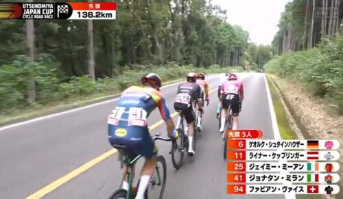猛烈なペースで走っている。先頭は7人に。JCL Team UKYOのシモーネ・ラッカーニが追いついている。