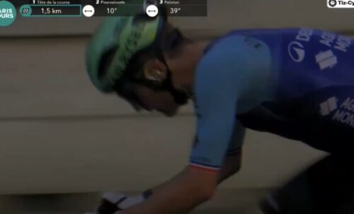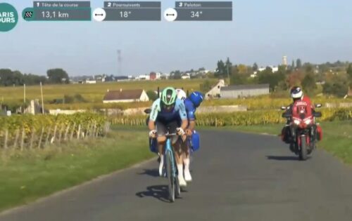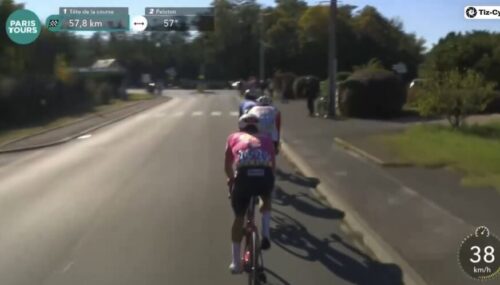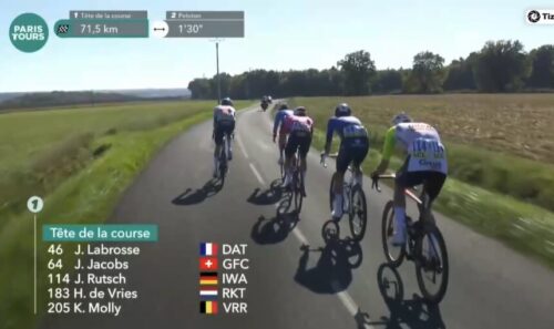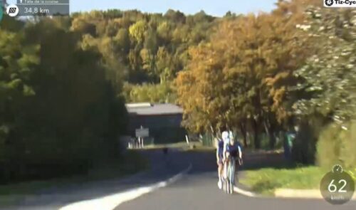 あららっ、昨日優勝したDecathlon AG2R La Mondiale Teamのドリアン・ゴドンが集団から遅れている。