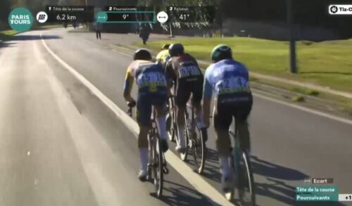 残り6.1kmに。追走は9秒。しかし、集団は41秒離れている。