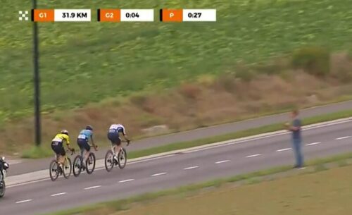 残り36.2km。集団は53秒差。追いつけばスプリント。追いつかなければ、ジャスパー・フィリップセン、ビニヤム・ギルマイはスプリントに参加できない。