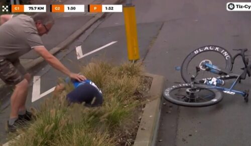 あっと、Israel – Premier Techのコービン・ストロングが落車。しかもかなり痛そう。