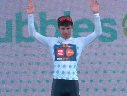 スタート前。マッティオ・マルチェリがリタイヤとなったのでUno-X Mobilityのアーランド・ブリクラがポイント賞ジャージに。