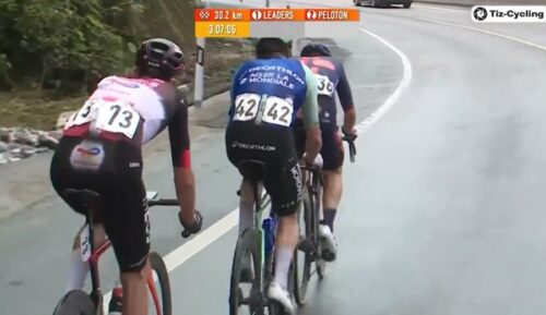 Team Jayco AlUlaの後ろには、ポール・マグニエのレッドジャージが~。
