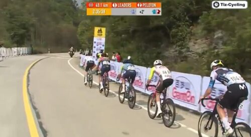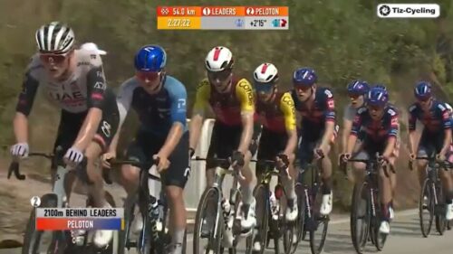 残り54kmで2分16秒差。集団はUAE Team Emirates – XRG、Israel – Premier Tech、Cofidisが引いている。