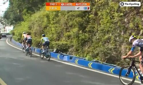 山岳賞ジャージのシモン・グリエルミが入った、5人が逃げている。
