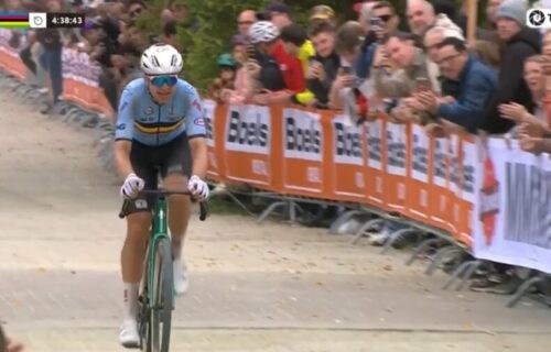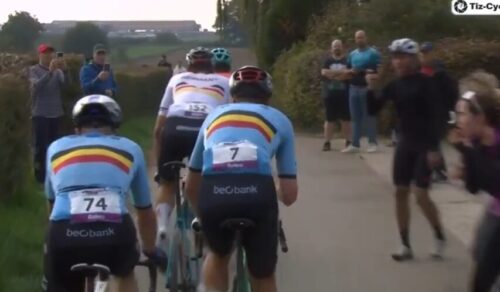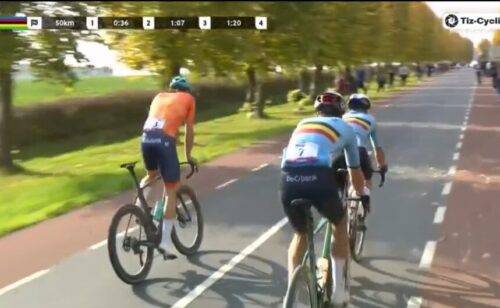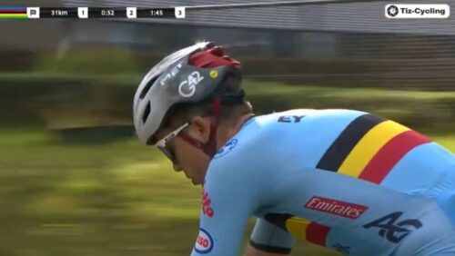 残り11km。ベルギー勢は追わない。スロベニアのマテイ・モホリッチと英国のトム・ピドコックが追いつかなければ決まりか。すでにもっともきつい登りは越えている。