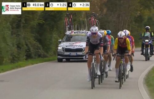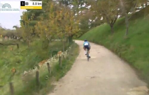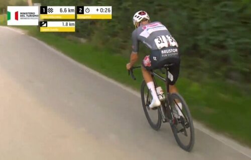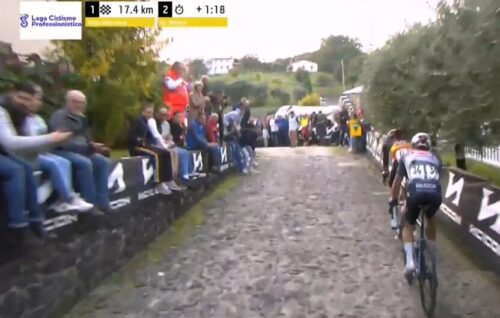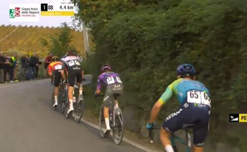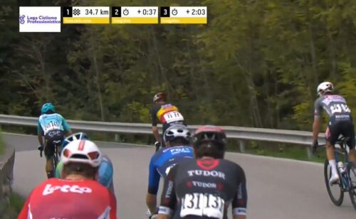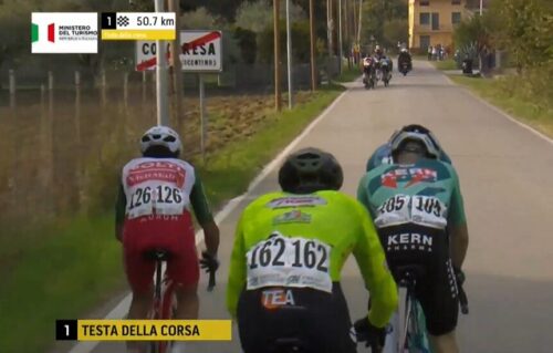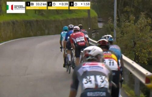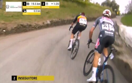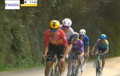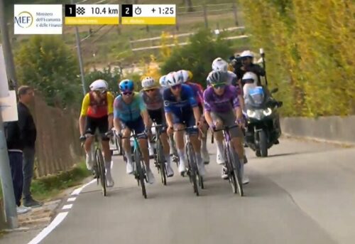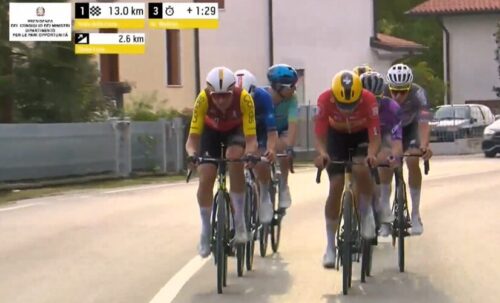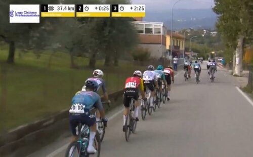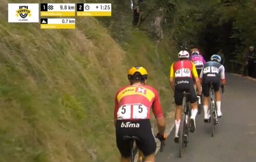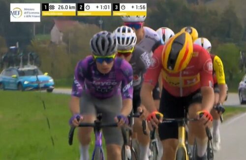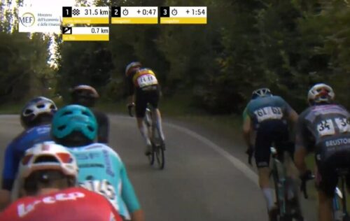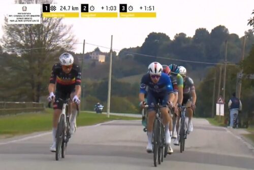 こちらは集団。UAE Team Emirates – XRGのティム・ウェレンスが動き出した。XDS Astana Teamのクリスティアン・スカローニ、Lottoのジェンノ・ベルクモエス、Tudor Pro Cycling Teamのマルク・ヒルシなどエースナンバーが揃っている。ただ、タイム差があいているので追いつくのか。
