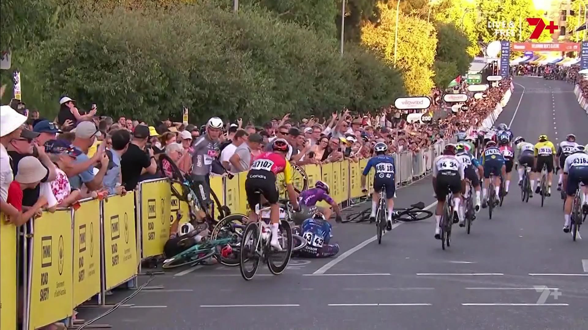 サム・ウェルスフォードが優勝したクラシックの最終カーブで、ライダーが道路脇のバリアに激突し、観客が重傷で入院した。