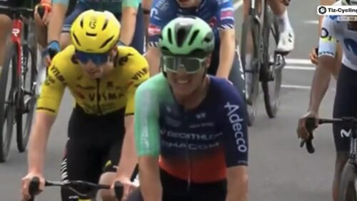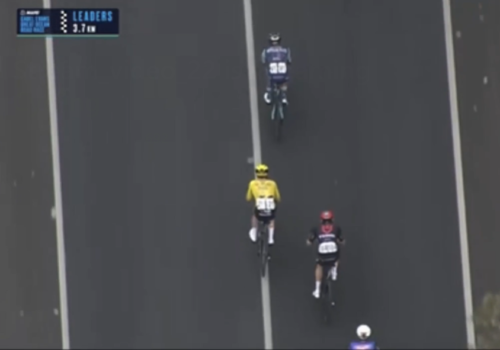 INEOS Grenadiersのミハウ・クフィアトコフスキがTeam Jayco AlUlaのベン・オコナーのホイールに乗っている。