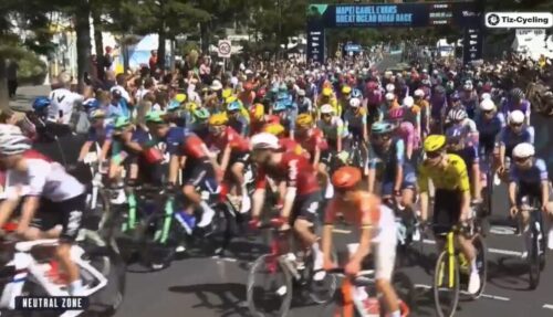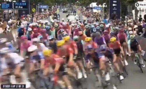 18人がゴールに向かう。Red Bull – BORA – hansgroheのローレンス・ピティもいる。