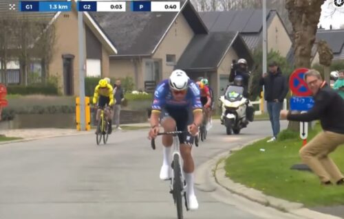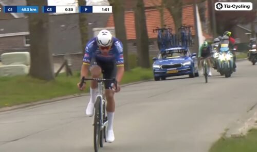 スタン・デウルフは追走に捕まる。フロリアン・フェルメルシュとヨナス・アブラハムセンだが、集団も後ろに見えている。
