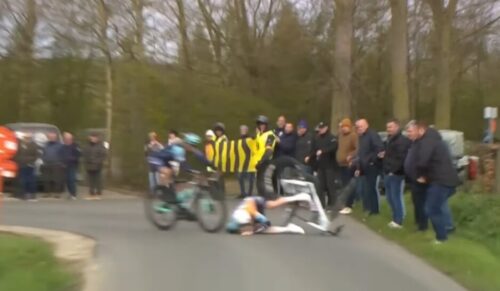 集団先頭で転倒。NSN Cycling Teamのスタン・ファントリヒトだ。