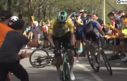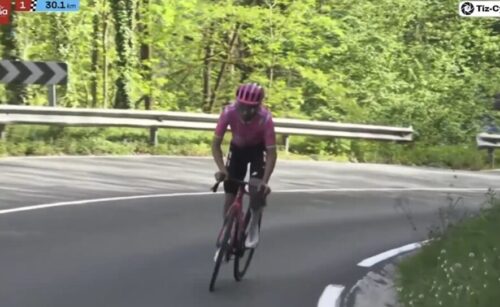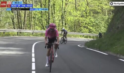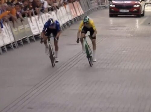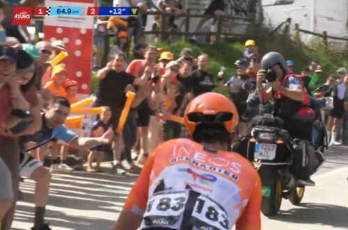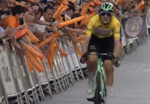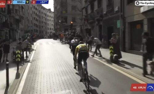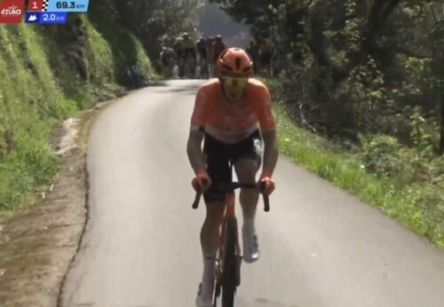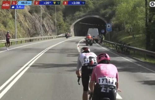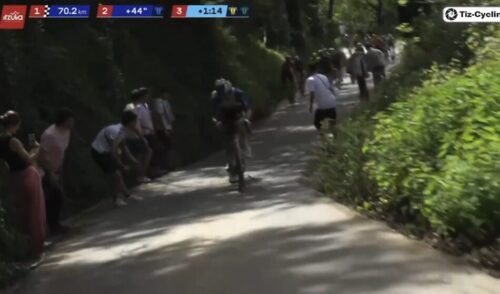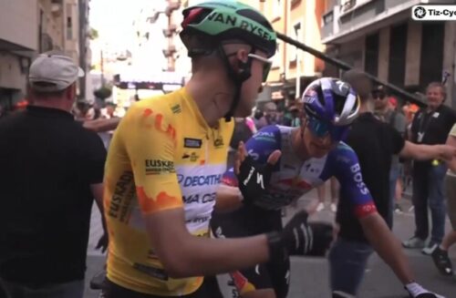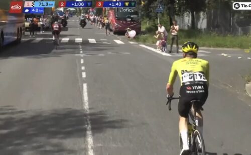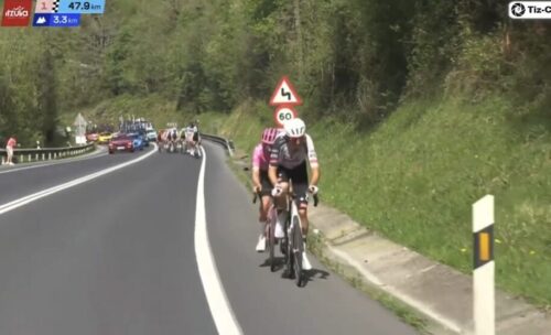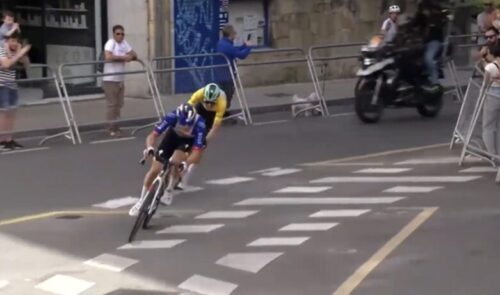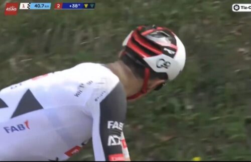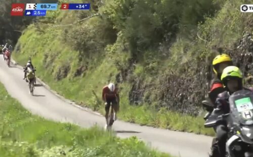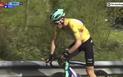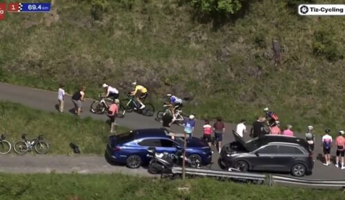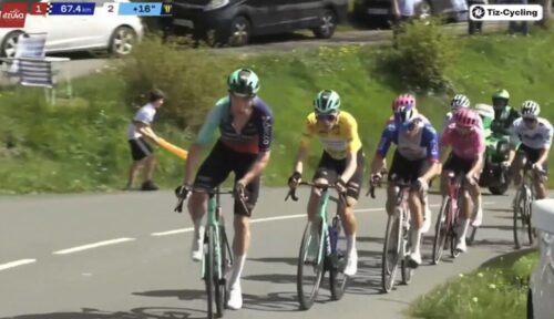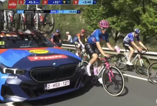 EF Education-EasyPostのマイケル・ベロキにLidl-Trekのチームカーがぶつかる。まあ、怪我はなかったみたい。