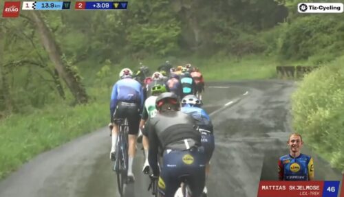ベン・ヒーリーとマティアス・スケルモースイェンセンが頑張っているけど、追走が後ろにきた。もう一緒になる。