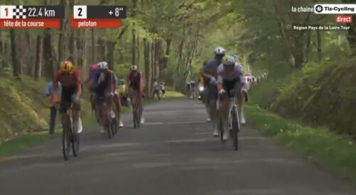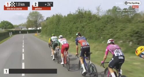 残り3.5km。集団はUnibet Rose Rocketsが引くけれど29秒離れている。