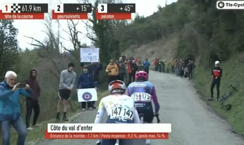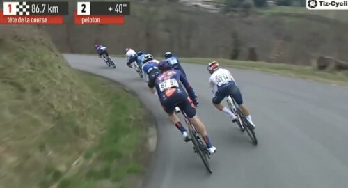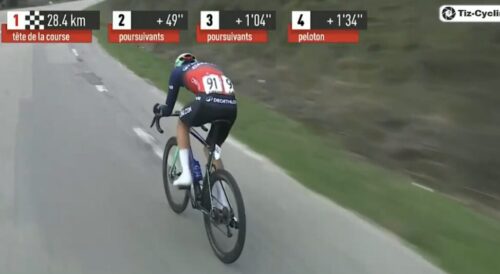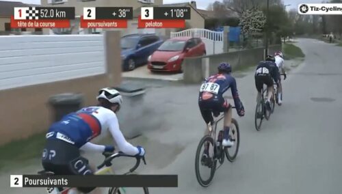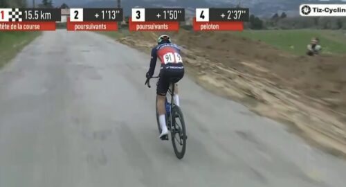 残り86.7kmで40秒差。元プロ二人が入っている。ローレンス・ハイスとヴィクトル・ゲルナレック。