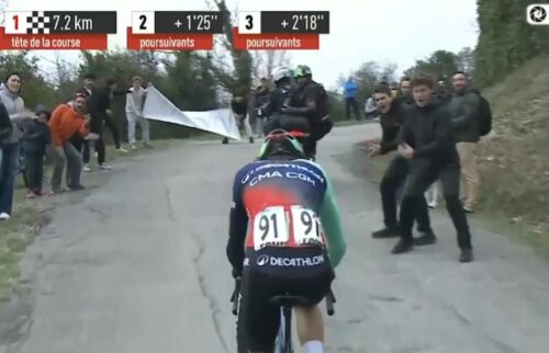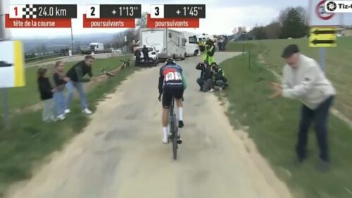 ポール・セイシャスはちゃんとグローブをしている。ベルギーで独走中のマチューは素手に半袖。