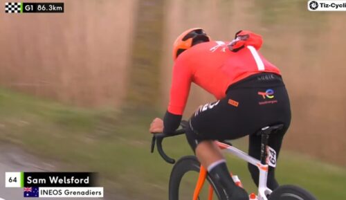 風による攻撃が始まった。まずは INEOS Grenadiersのサム・ウェルスフォードが遅れている。