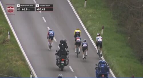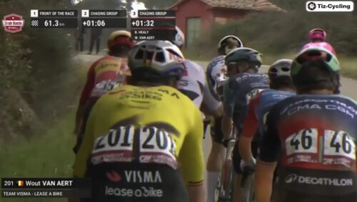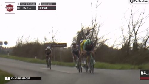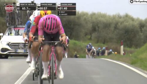 集団は1分40秒遅れている。ベン・ヒーリー、ワウト・ファンアールトが集団の前に。