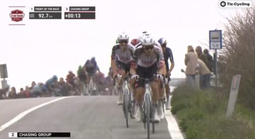 残り92.7kmで13秒しかない。UAE Team Emirates – XRGが集団牽引。