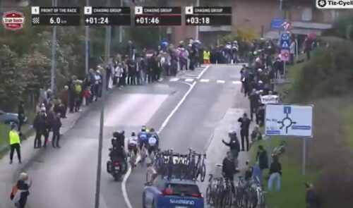 こちらが第2追走。第1追走と20秒差なので追いつくのでは。そうなるといよいよ集団対ポガチャルの戦いとなる。しかし、決戦の場はまだ先なのにねえ。