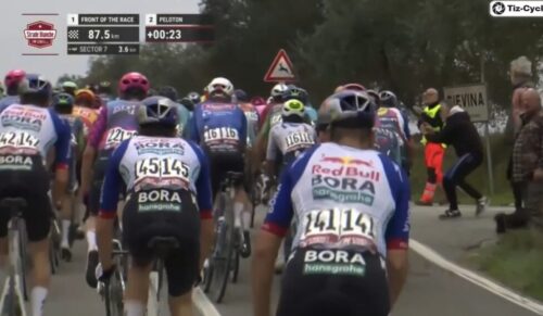 集団最後尾はRed Bull – BORA – hansgroheのジャンニ・フェルメルシュ。調子悪いのか。