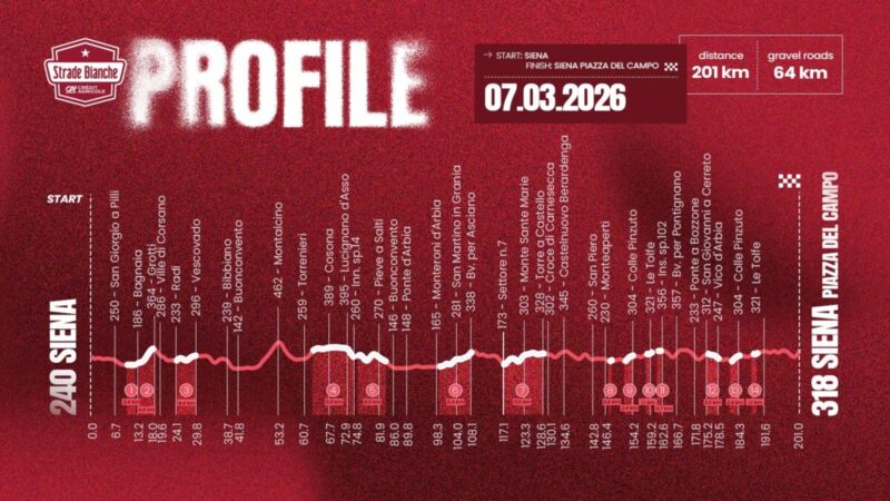イタリア中部のトスカーナ州に設定された全長201kmのコースには14カ所、合計64.1kmの未舗装区間(セクター)が登場する。