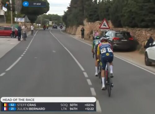 ジュリアン・ベルナールがステフ・クラスをちぎって上る。いつもは集団先頭を牽引することが多いがこれは見せ場だ。