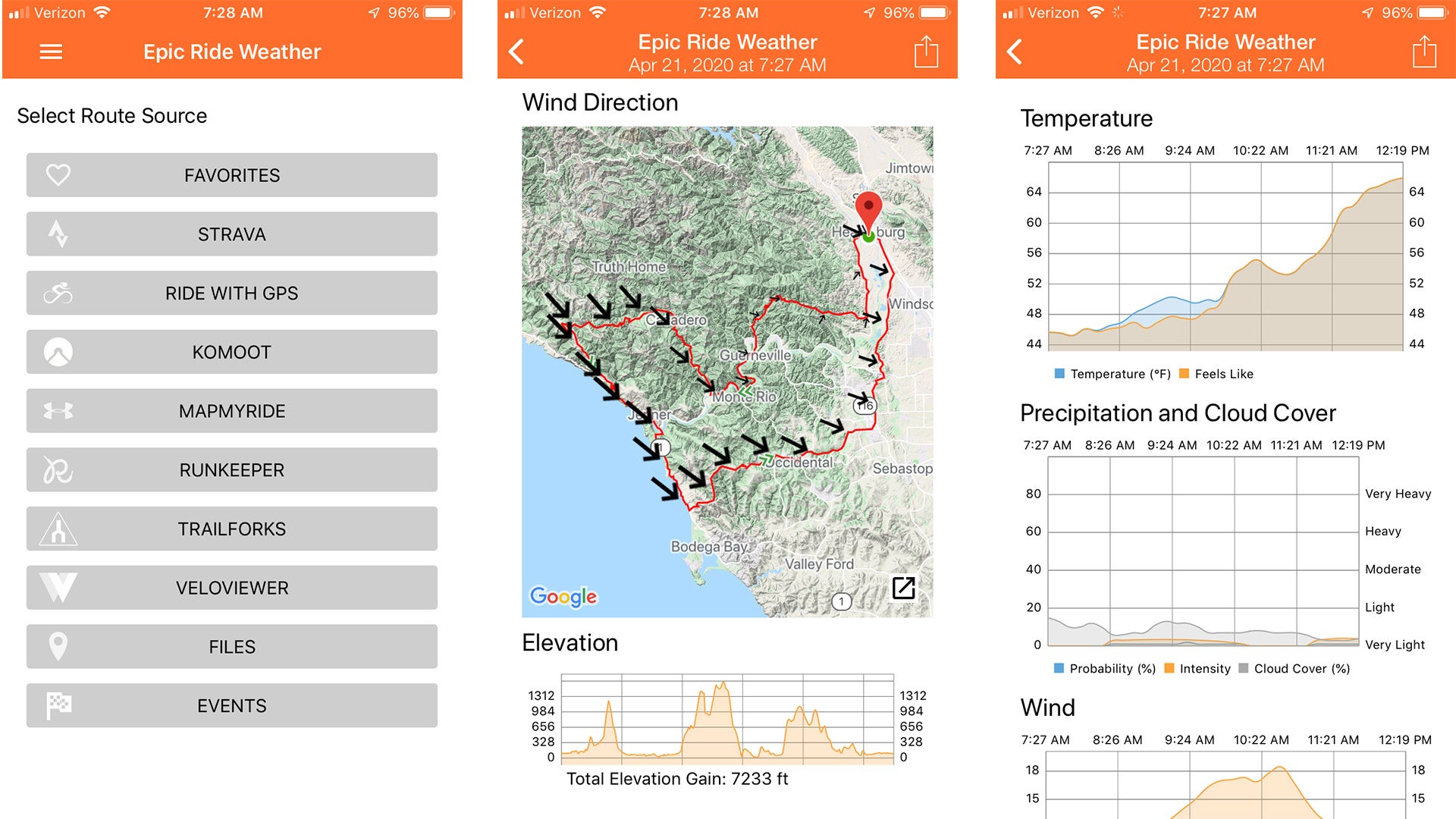 Epic Ride Weatherは、Strava、Ride With GPS、Komoot、MapMyRide、Trailforks、Runkeeper、TCX、またはGPXファイルからのルートを使用して、ライド中の気温、降水量、風速、風向を予測する。