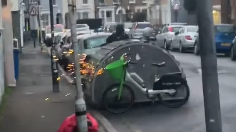 白昼堂々とアングルグラインダーで鍵を壊して自転車を盗んでいる。