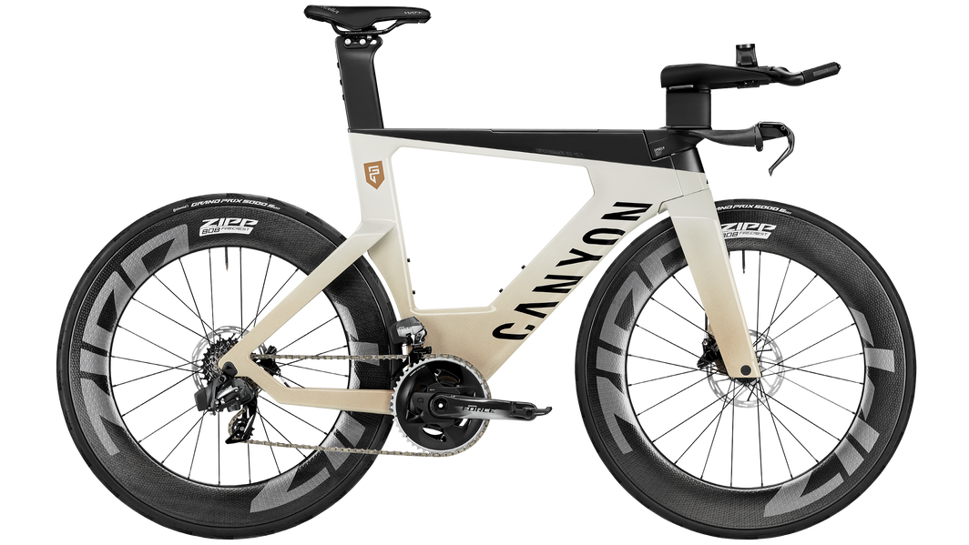 Zipp 808 Firecrest カーボン ホイールには Continental Grand Prix 5000 S タイヤが装着されており、 Canyon CP0019 ベースバーは調整可能となっている。