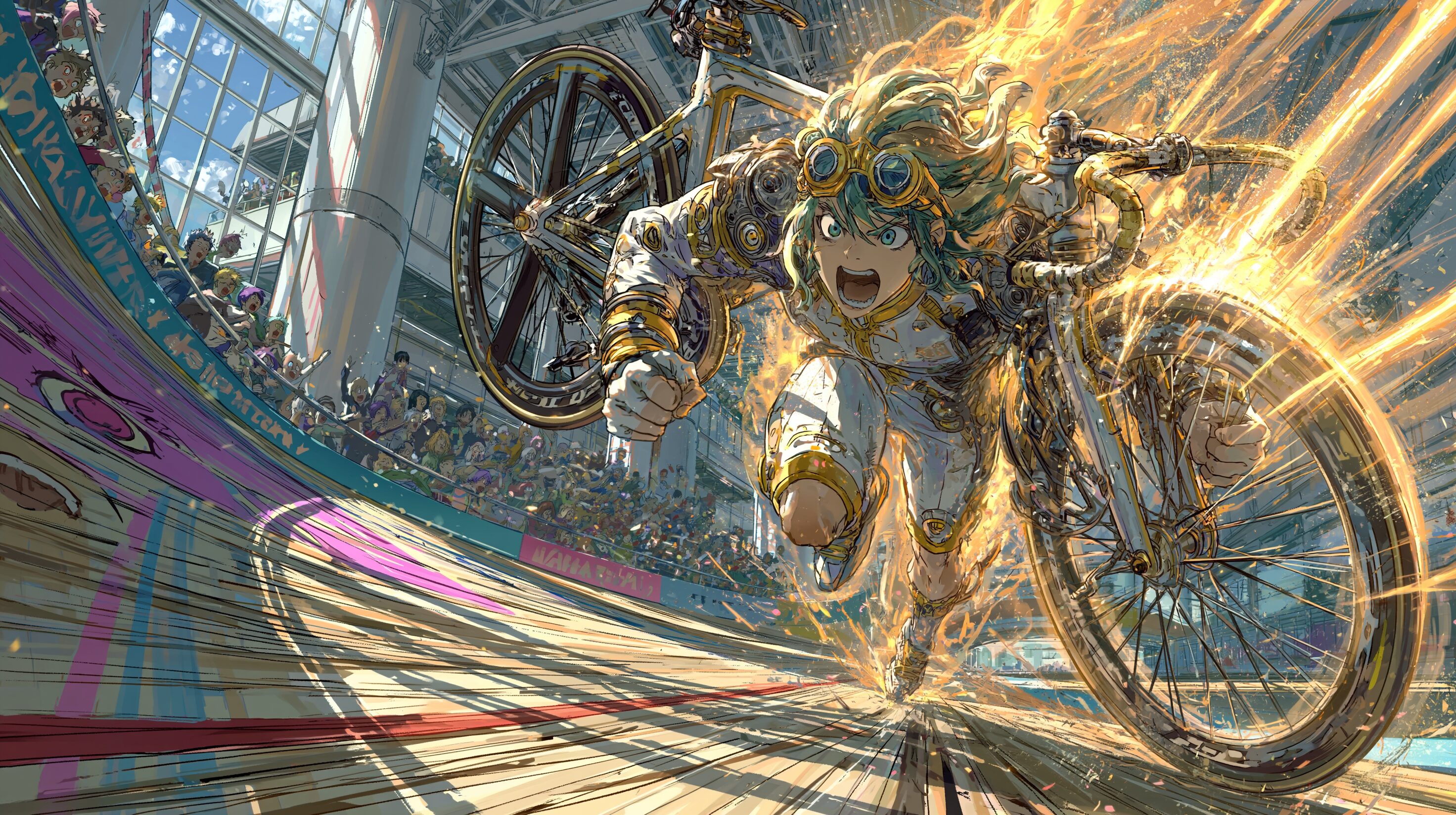 この混乱の中、ロシア出身のニキータ・キリルツェフは、自身の自転車のトップチューブを掴むと、トラックの最終コーナーからホームストレートにかけての200mを自転車を担いだまま走り出した。