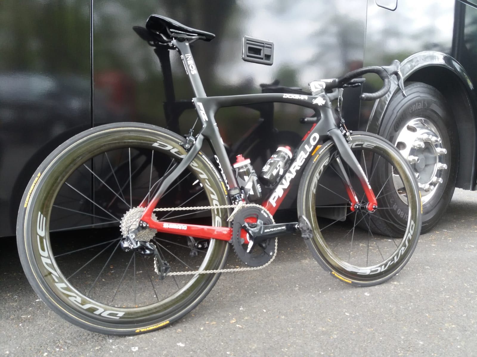 対照的なPinarelloデカールは、黒と赤のフェードペイントデザインを採用。