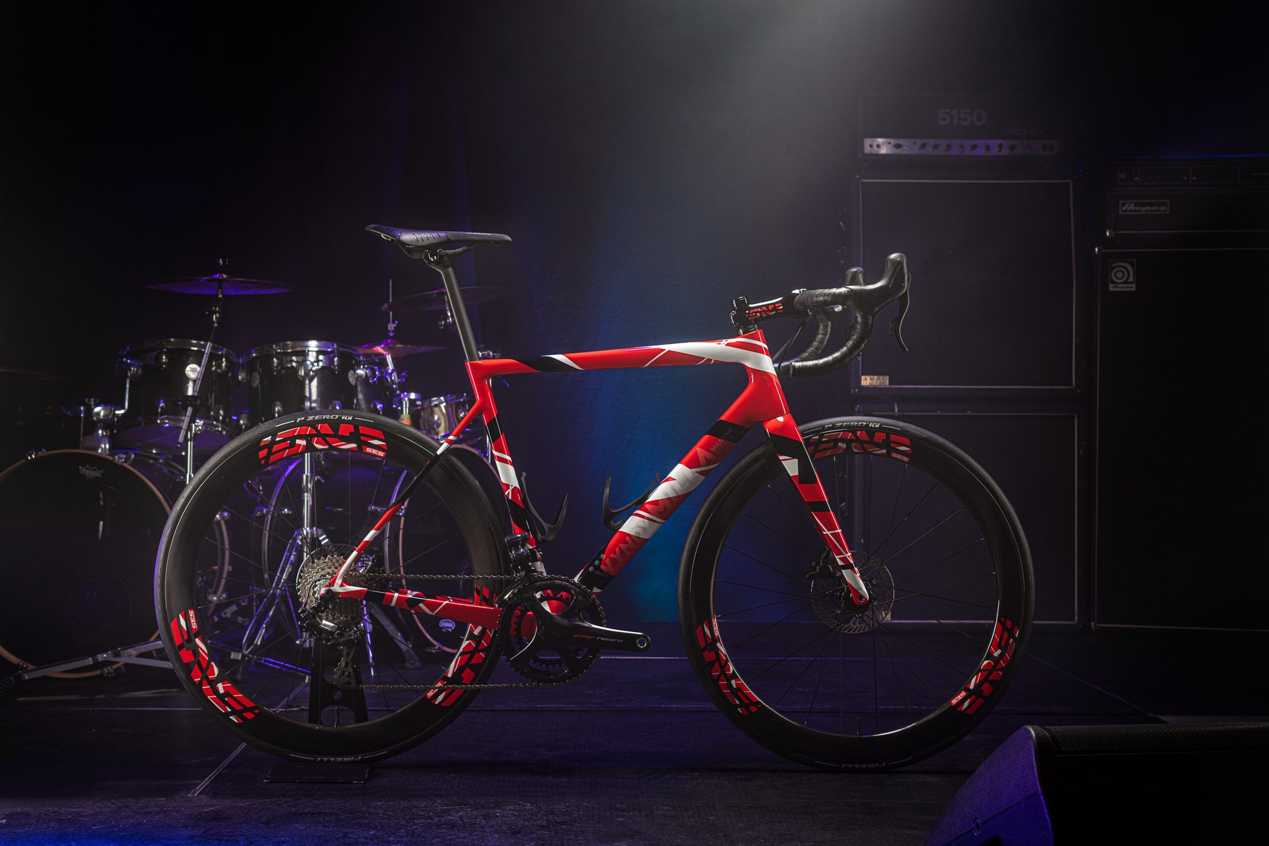 ENVE AR4.5ホイールと、コンポはCampagnolo Record / Super RecordEPSグループセットを使用しており、このバイクに相応しいハイエンドな構成となっている。