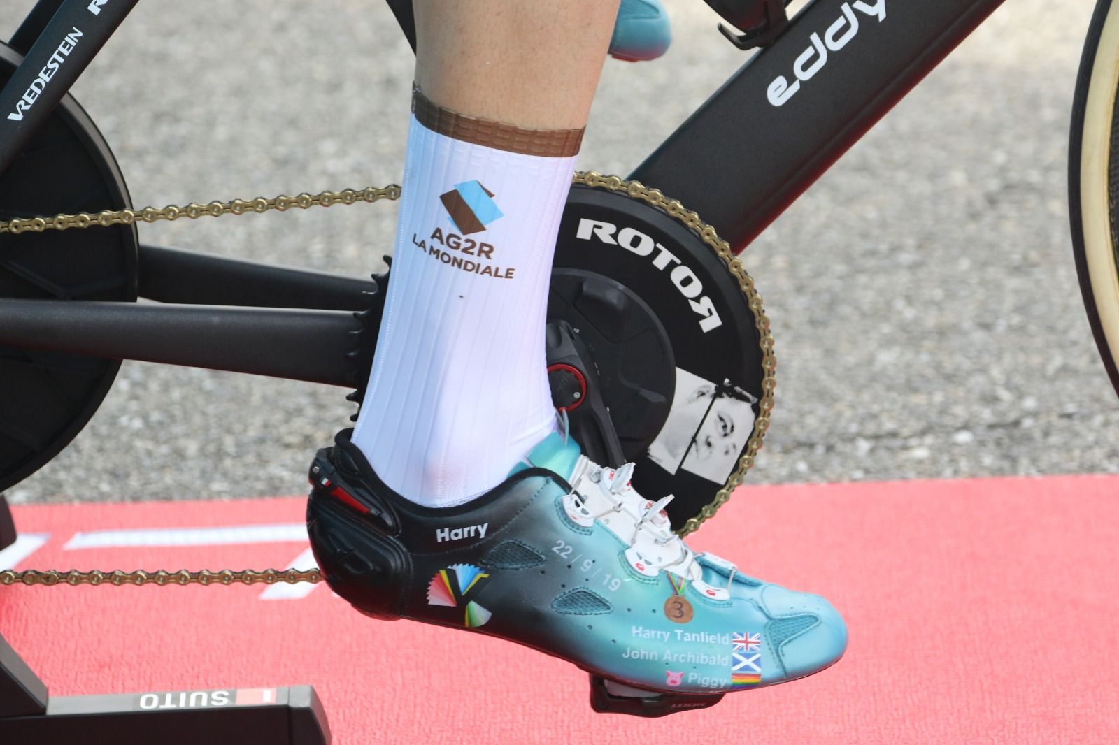 ブエルタ第13ステージの個人タイムトライヤルで、AG2R La Mondialeのハリー・タンフィールドがカスタムペイントされたシューズを披露。