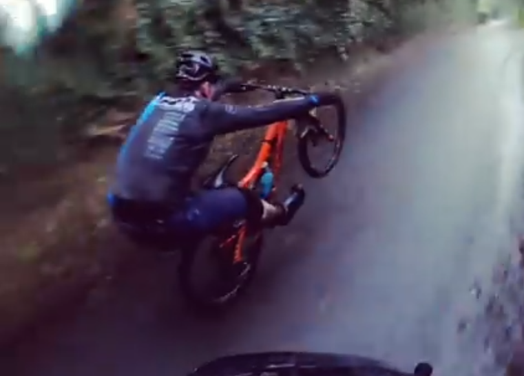 彼にとってはただ下るだけなので、なんでもないでしょうけど延々とウイリーで下ってますね。