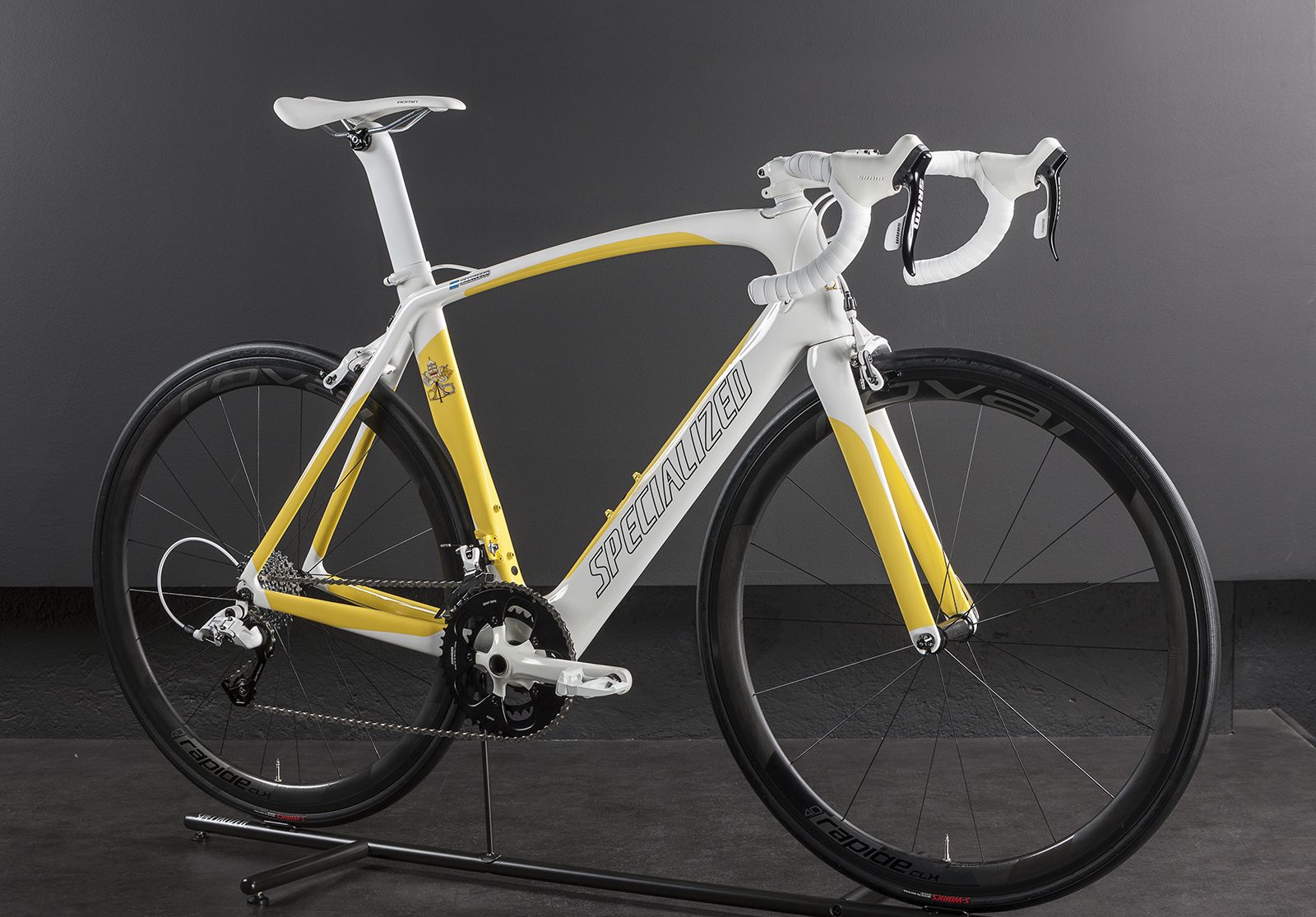 このSpecialized Vengeは、バチカンの旗の白と黄色の色で装飾され、教皇の名前で装飾されている。