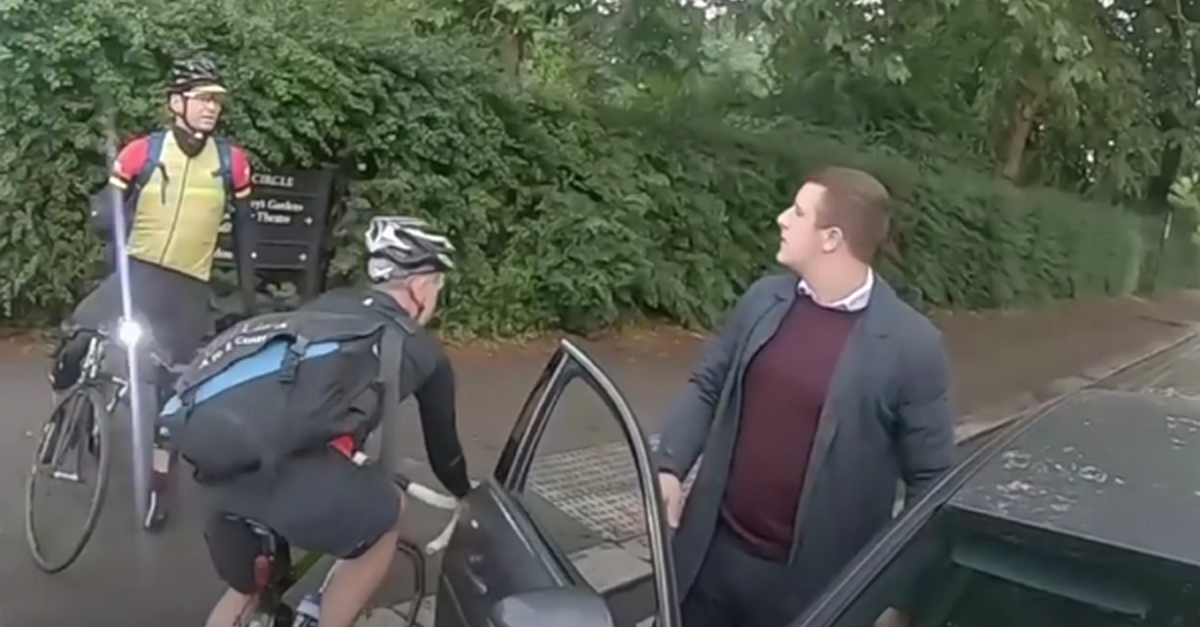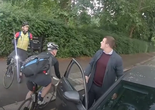 カメラを手に持ったサイクリストによって妨げられていることに苛立ち、ついには車を降りてくる!